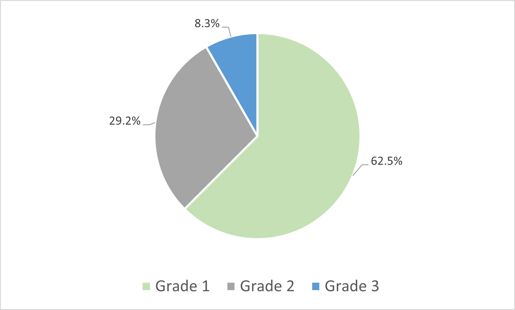 Grades 1, 2, and 3 HTN were found in 62.5%, 29.2%, and 8.3% of the patients, respectively (Figure 2).