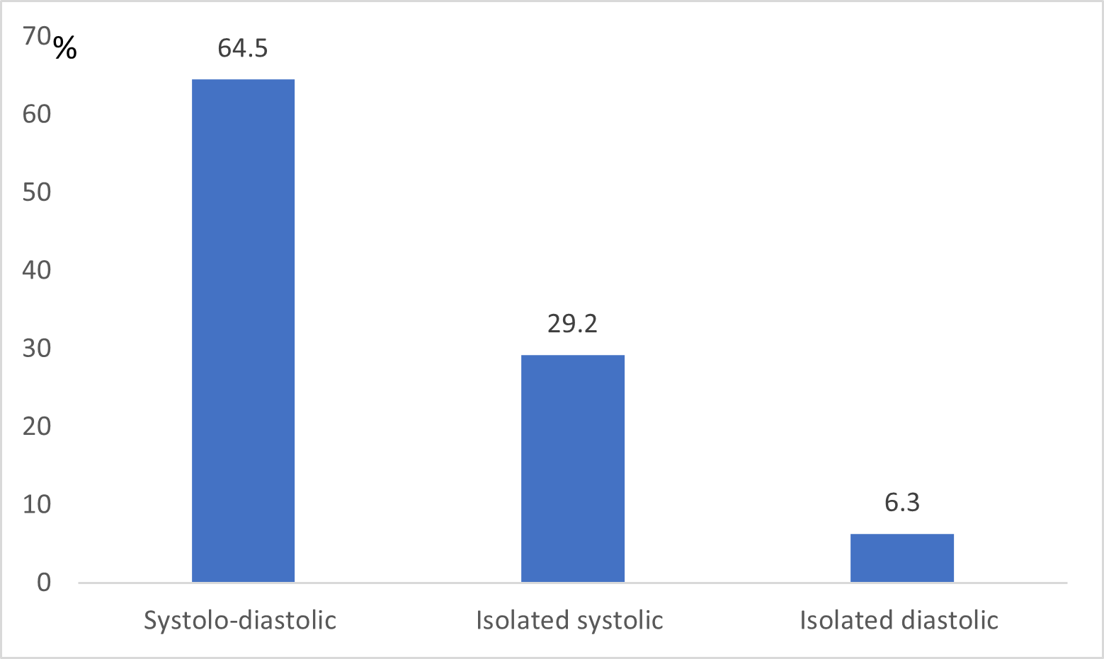 Systolic–diastolic HTN was the most common HTN (64.5%), followed by isolated systolic HTN (29.2%) and isolated diastolic HTN (6.3%) (Figure 3).