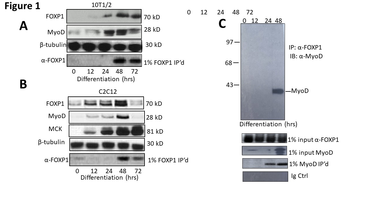 Figure 1: FOXP1 and MyoD are coordinately expressed and interact physically in vivo. A, B. FOXP1 and MyoD expression peaks at ~3 days following serum withdrawal-mediated differentiation in C2C12 myocytes and or 5-azacytidine-mediated differentiation in 10T1/2 fibroblasts. SDS-PAGE fractionation was followed by anti-MyoD Ab or anti-FOXP1 Ab Western blotting. C. FOXP1 and MyoD heterodimerize in differentiated C2C12 myoblasts. Standard co-immunoprecipitation (Co-IP)/Western blotting was performed 3 days following serum withdrawal. Nuclear lysates were immunoprecipitated with anti-FOXPI Ab, fractionated on SDS gels and then blotted with anti-MyoD Ab. IP, immunoprecipitation; WB, Western blotting; Loading controls (CTRL) include 1% input lanes, 1% IP’d lanes, Ig-only, and β- tubulin loading controls. Molecular weights are indicated on the right.