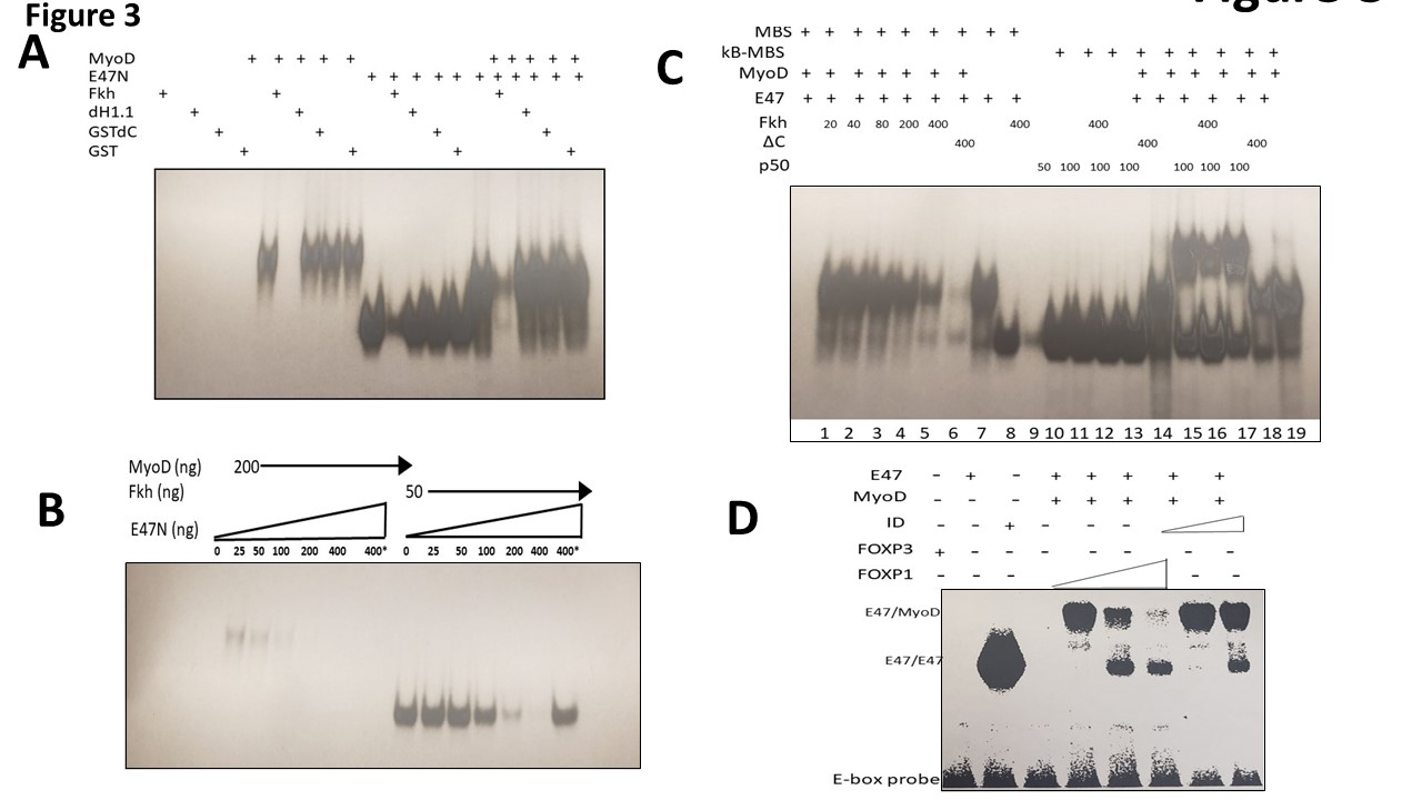 Next, we tested the effect of different concentrations of FOXP1 on formation of MyoD-E47 heterodimers; GST-dC served as control (Figure 3C). In lanes 10-19, we employed as probe an oligonucleotide that contains binding sites for MyoD and for NF-κB p50. We observed that in Lanes 10- 13, p50 binds specifically to its DNA recognition site and GST-Fkh does not inhibit its binding. In Lanes 15- 17, we observed that binding of MyoD-E47 heterodimers and p50 homodimers to their respective sites occur even when delivered on the same oligonucleotide probe. The lower complex is composed of p50 and the upper complex represents double occupancy. As shown in Lane 16, GSTFkh primarily inhibits MyoD-E47 complexes, further supporting the specificity of the interaction. The GST-dC mutant in Lane 17 has no inhibitory effect.