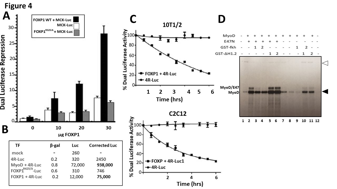 The data supporting this hypothesis and the additional experimental extensions generated in this report are: 1) FOXP1 heterodimerizes selectively with MyoD and not with other MRFs or bHLH domains; 2) this interaction competes with MyoD homodimerization and/or with MyoD-E47 heterodimerization; 3) through this “quenching interaction, FOXP1 represses the ability of MyoD to transactivate E-box driven promoters; 4) FOXP1 impedes the ability of MyoD to catalyze myocyte to myoblast differentiation.