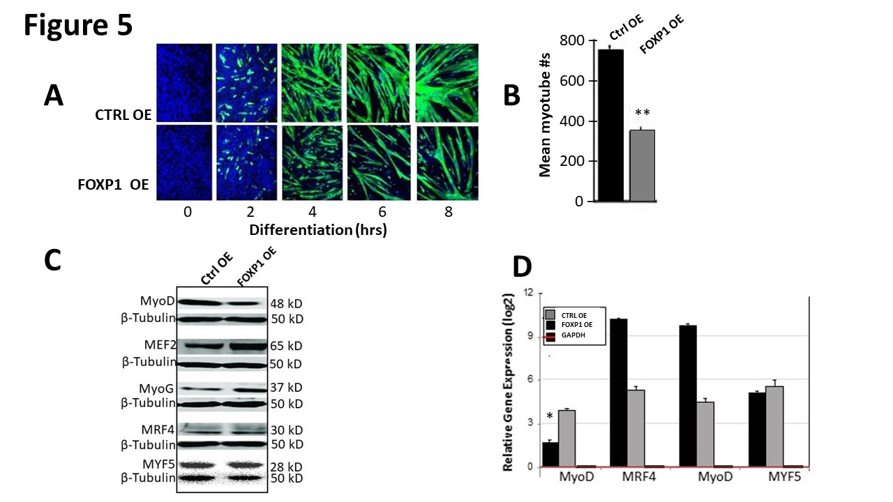 When FOXP1 overexpression in C2C12 myocytes was initiated following serum withdrawal-mediated differentiation, significant retardation of myotubes was observed (Figure 5A and Supplementary Figure 5). FOXP1 repression was selective, as we observed no reduction of MYF5, MyoG, or MRF4 accumulation when measured either at the protein or RNA levels (Figures 5B and 5C).