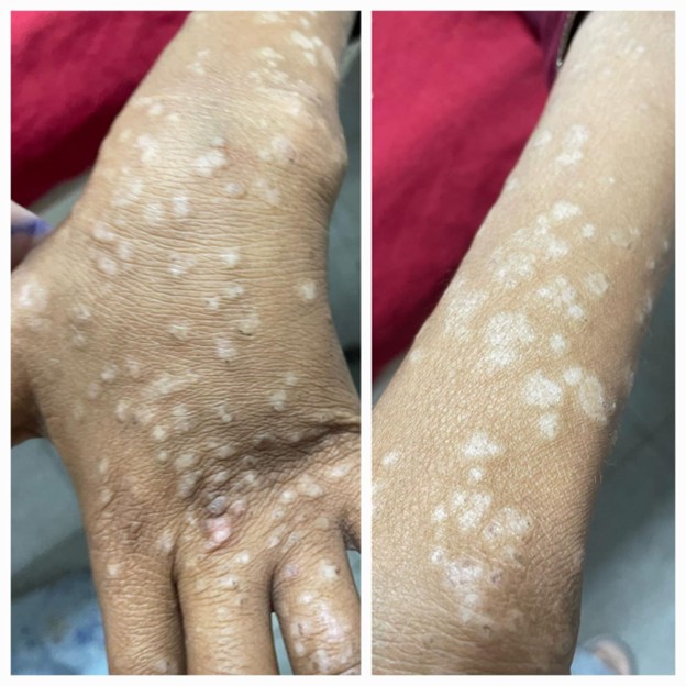 Figure 1. Hypopigmented macules over extensor surfaces, consistent with discoid lupus erythematosus sequelae.