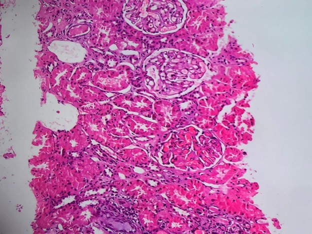 Figure 2. High-power view (H&E stain) highlighting glomeruli with uniform capillary wall thickening and mild mesangial expansion, consistent with membranous features of Class V Lupus Nephritis. No significant endocapillary hypercellularity or necrosis is noted. Activity score: 03, Chronicity score: 02.