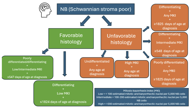 Under the microscope, neuroblastomas present as uniform, small round blue tumor cells [90]. Another popular diagnostic feature includes “Homer-Wright rosettes”. This name represents the neural fibrils and bundles of cells seen in neuroblastomas described by James Wright in his landmark paper in 1910 [91]. In the present day, neuroblastomas have a range of histopathologic diversity that can impact the prognosis and course of treatment of the disease. The International Neuroblastoma Pathology Classification (INPC) system is recommended by National Comprehensive Cancer Network® (NCCN®) guidelines to predict outcomes and guide treatment intensity. NCCN advises that histologic classification based on INPC should be made before initiation of therapy [92]. The classification can be seen broken down in Figure 2. Histologically, the diagnosis of neuroblastoma is completed by distinguishing it from peripheral neuroblastic tumors including ganglioneuroblastoma (intermixed), ganglioneuroblastoma (nodular), and ganglioneuroma [93]. NBs are identified as Schwannian stroma poor, then further classified as favorable or unfavorable depending on the grade of neuroblastic differentiation, mitosis-kayorrhexis index (MKI), and age at diagnosis [94]. Neuroblastic differentiation of NB cells includes undifferentiated, poorly differentiated, or differentiating while the MKI is the estimated mitotic and karyorrhectic nuclei per 5,000 neuroblastoma cells. Below 100 is considered low, intermediate between 100–200, and over 200 is high [95]. NB tumors fall under the Favorable Histology category if they fall into one of two groups. The first group includes poorly differentiated or differentiating subtypes with low or intermediate MKI and less than or equal to 547 days of age at diagnosis [95]. The first group includes poorly differentiated or differentiating subtypes with low or intermediate MKI and less than or equal to 547 days of age at diagnosis [94]. The second group includes tumors with the differentiating subtype with low MKI and less than or equal to 1,824 days of age at diagnosis [95]. The Unfavorable Histology tumors can fall within 5 groups; 1) undifferentiated subtype at any age, 2) high MKI at any age, 3) poorly differentiated subtype with any MKI with more than or equal to 548 days of age at time of diagnosis, 4) differentiating subtype with intermediate MKI with mora than or equal to 548 days of age at diagnosis, and 5) differentiating subtype with any MKI with more than or equal to 1,825 days of age at diagnosis [94]. All of these factors must be considered and determined of NB tumor before treatment can begin, thus contributing to the complexity of NB management and course of treatment.