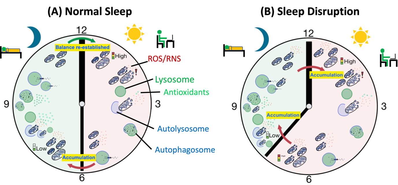 Figure 2. Sleep Disruption leads to metabolic waste build-up. (A) Metabolic activity during the day leads to accumulation of metabolic waste and the balance, between waste production and waste clearance, is tipped towards waste production leading to a build-up of metabolic waste. During the night when autophagy is higher waste clearance is high leading to cleanup of the cellular debris. (B) Sleep deprivation or loss of sleep tips the balance towards waste production and build-up which overpowers the autophagic waste clearance. Continuous imbalance in waste clearance leads to further accumulation of metabolic waste to toxic levels eventually leading to cell death.