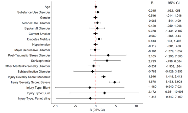 Multivariable regression analysis revealed a statistically significant positive association between age and LOS (B=0.045, p<.001). Both moderate (B=1.95, p<.001) and severe (B=4.68, p<.001) injury severity scores were statistically significantly associated with an increased LOS. Diabetes mellitus as a comorbidity was also statistically significantly associated with an increased LOS (B=0.81, p=.020). The presence of substance use disorder as a comorbidity was not statistically significant in relation to LOS, (B=0.52 (p=.056). Additionally, no statistically significant associations were found between LOS and gender, alcohol use disorder, bipolar disorder, smoking status, hypertension, major depressive disorder, post-traumatic stress disorder, schizophrenia, mental/personality disorders, schizoaffective disorder, or injury type. Figure 1 displays a histogram of frequency distribution of the LOS variable during the study. Figure 2 presents unstandardized regression coefficients and 95% confidence intervals from a multivariable analysis of correlates of length of stay.