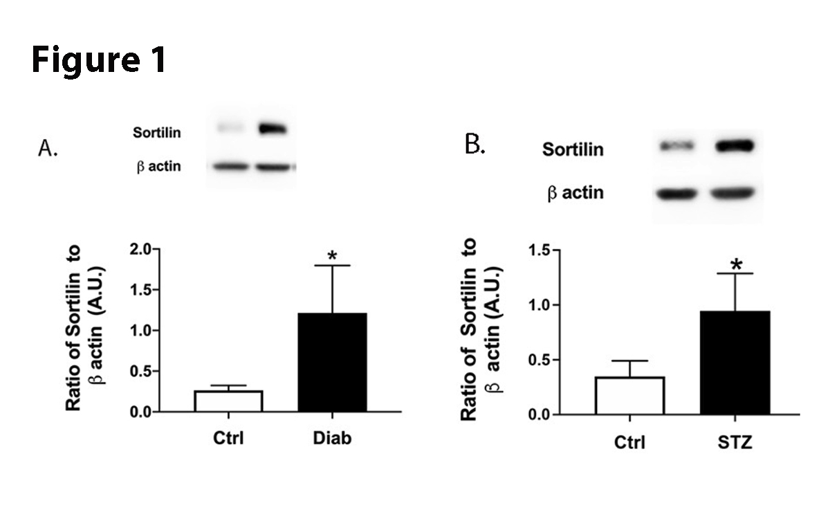 Figure 1. Protein levels of sortilin from retinal lysates from control (N=4) and diabetic (N=5) patients (A). Panel B is protein levels of sortilin in control and diabetic mice (N=5 for ctrl and STZ). Data are mean±SEM. *P<0.05 vs. Ctrl measured by two-tailed T test.