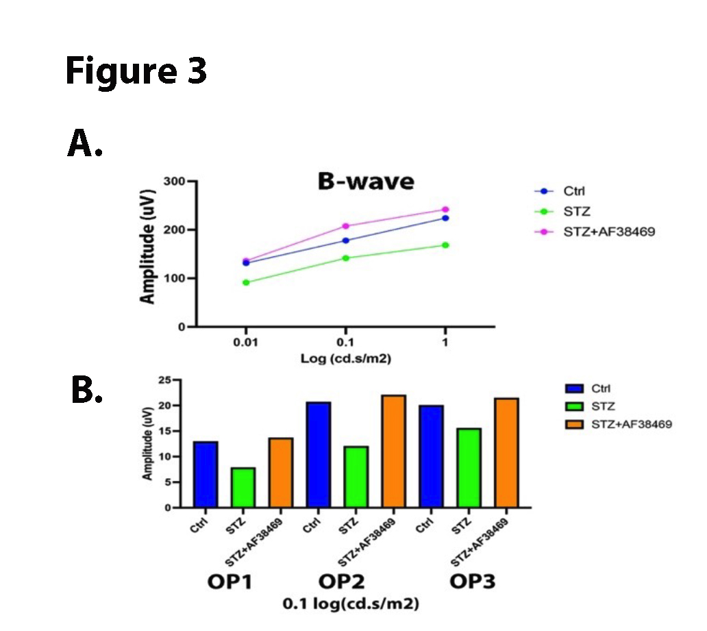 Figure 3. Data show ERG findings for control (Ctrl), diabetic (STZ), and diabetic +oral AF38469. Top Panel is B-wave amplitude, and bottom panel is oscillatory potentials. Data represents a mean amplitude of 5 mice.