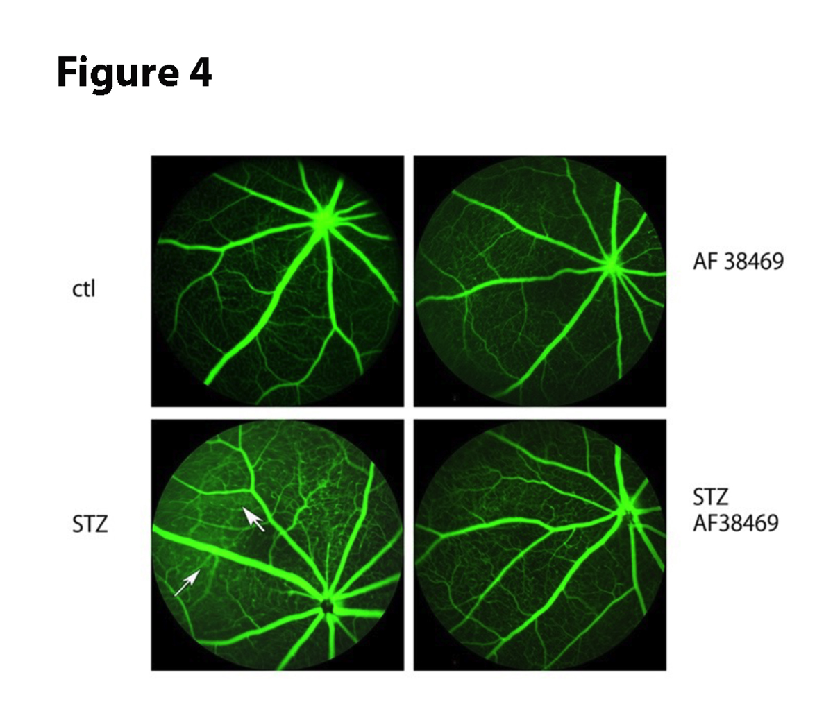 Figure 4. Fluorescein angiography for control (Ctl) and 6-week diabetic mice (STZ, left panels) and control +AF38469 (top right) and STZ+AF38469 (bottom right). Arrows show areas of leakage in STZ.