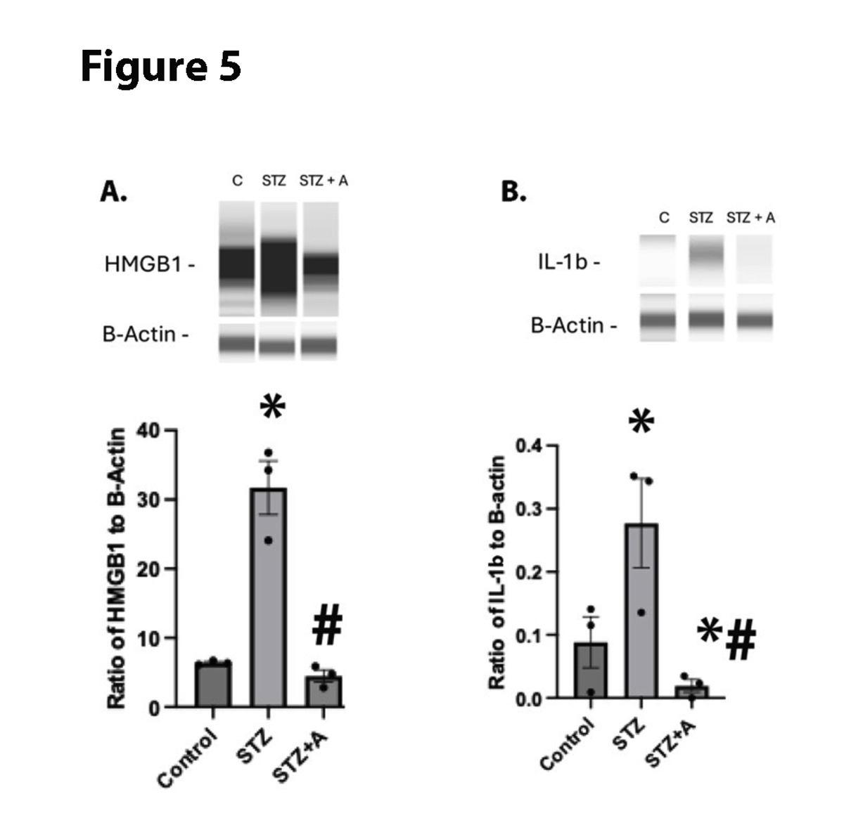 Figure 5. HMGB1 (A) and IL-1B (B) levels in whole retinal lysates from control, diabetic (STZ), or diabetic+AF38469 (STZ+A). *P<0.05 vs. Control, #P<0.05 vs STZ assessed by 1 way ANOVA. N=3.