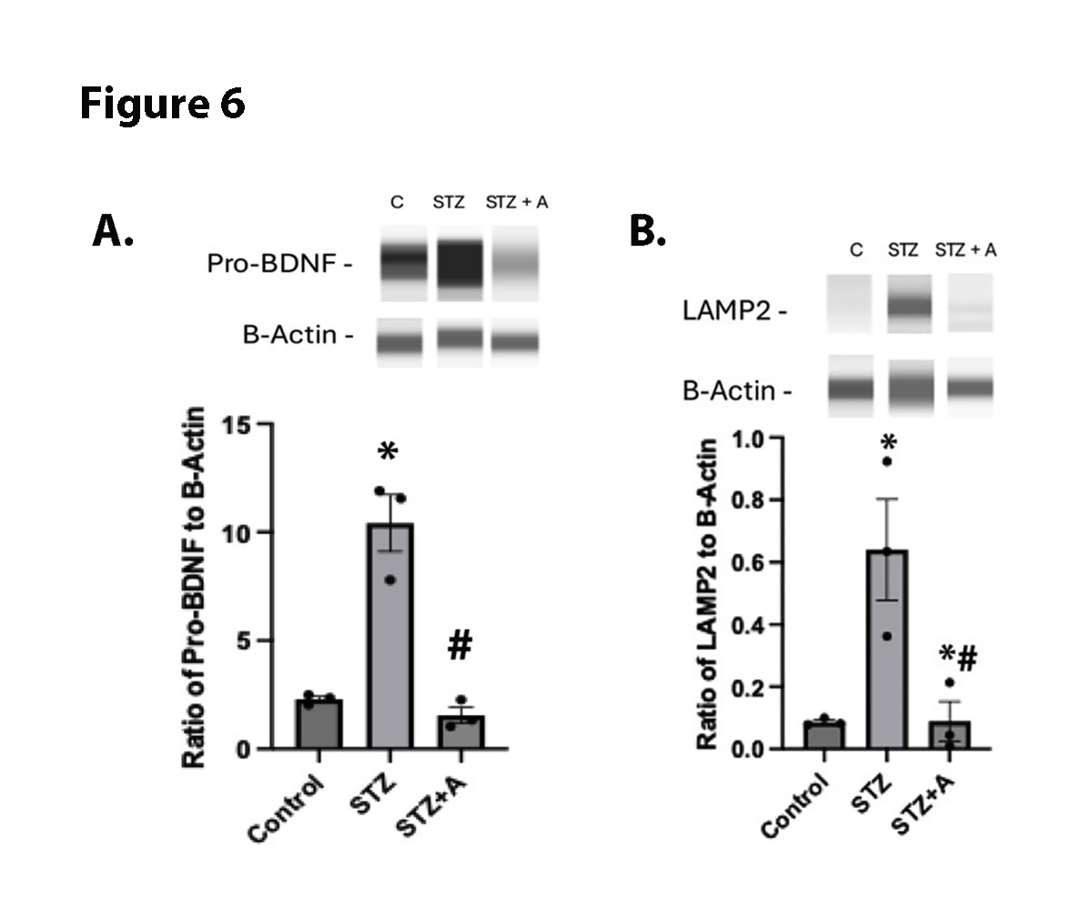Figure 6. Panel A is ProBDNF levels in whole retinal lysates from control, diabetic (STZ), or diabetic+AF38469 (STZ+A). Panel B is LAMP2 levels in in whole retinal lysates from control, diabetic (STZ), or diabetic+AF38469 (STZ+A). For both panels, *P<0.05 vs. Control, #P<0.05 vs STZ assessed by 1 way ANOVA. N=3.