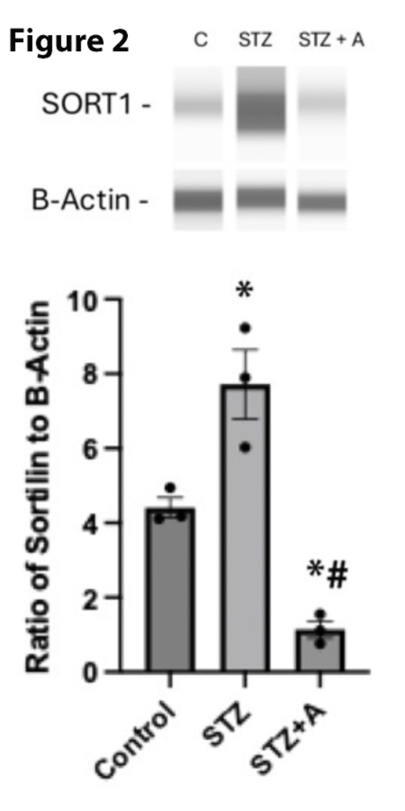Figure 2. Sortilin protein levels in control, diabetic (STZ), and diabetic mice treated with AF38469 (STZ+A). *P<0.05 vs. control, #P<0.05 vs, STZ assessed using 1-way ANOVA. N=3.