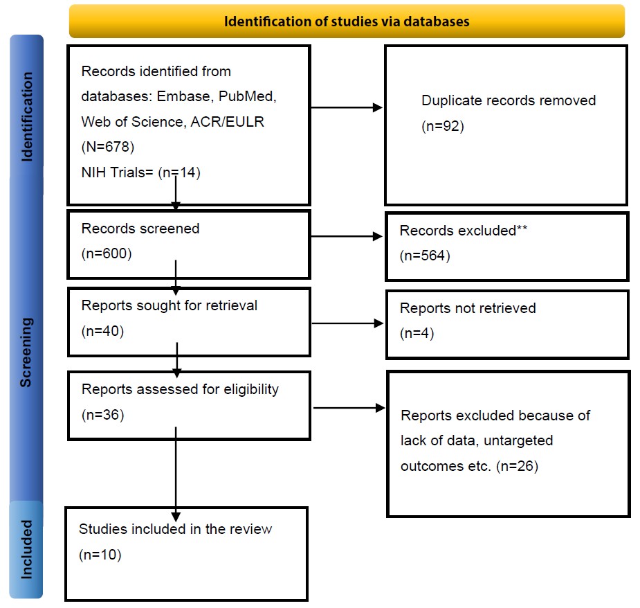 Comprehensive searches were performed in PubMed/MEDLINE, NIH Trials, Embase, CENTRAL, Web of Science, and ACR/EULAR (inception to July 2024). Strategies combined controlled vocabulary and free-text terms for “gout,” “gouty arthritis,” and IL-1 inhibitors. Two reviewers independently screened records in Covidence, with disagreements resolved by a third reviewer. A PRISMA flowchart documented the process (Figure 1).