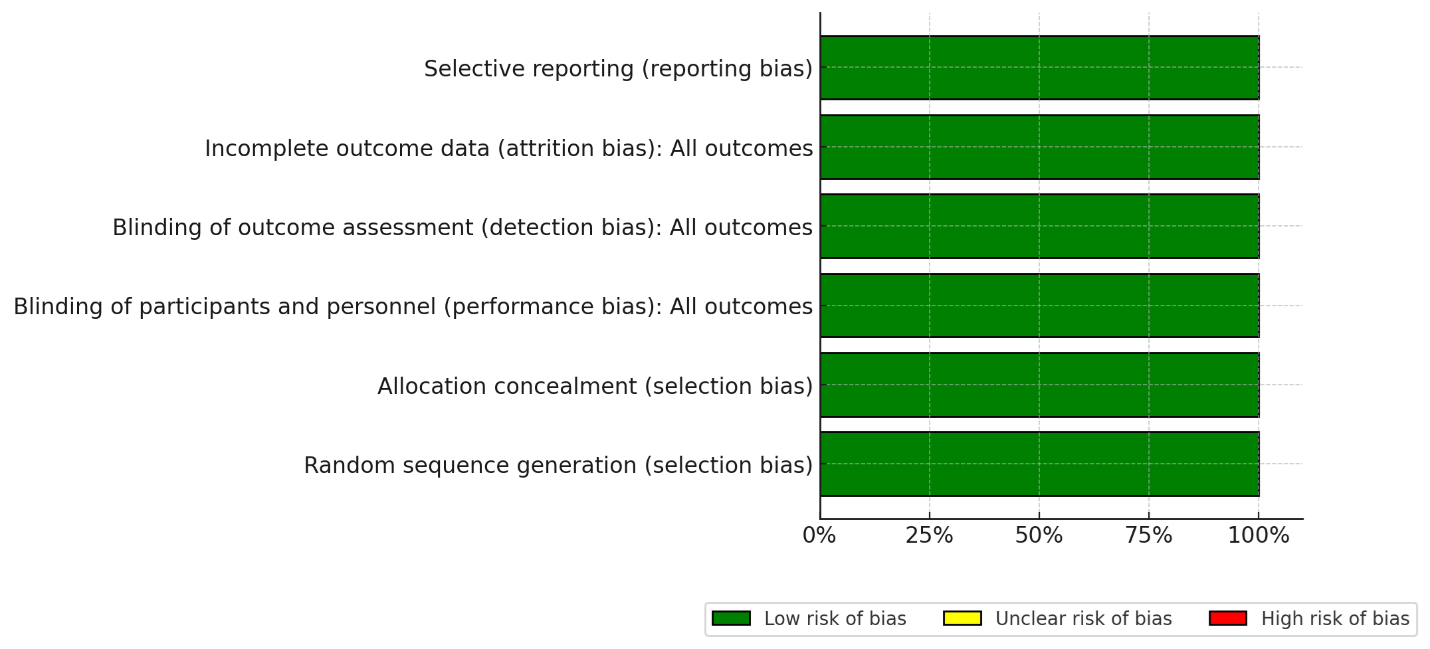 Two reviewers independently extracted study characteristics (design, setting, duration), patient demographics (age, sex, comorbidities, BMI, baseline uric acid), intervention/comparator details (drug, dose, route, regimen), and all outcome data (mean values, SDs, events/total). Authors were contacted for missing information. For studies where standard deviations (SDs) were not reported, they were estimated from figures or calculated from available data (e.g., standard errors, confidence intervals); this is noted as a potential limitation Risk of bias was appraised by two reviewers assessed RoB independently using Cochrane RoB 2 across randomization, deviations, missing data, outcome measurement, and selective reporting while all studies show low risk of bias (Figure 2). For trials with multiple publications [12,13], we used the most complete report per endpoint to avoid double counting. For publications reporting multiple independent RCTs [14], each trial was extracted and analyzed separately. Pain assessment followed a pre-specified hierarchy: 72-hour data were used primarily; if unavailable, 48-hour data were used, followed by 24-hour data.
