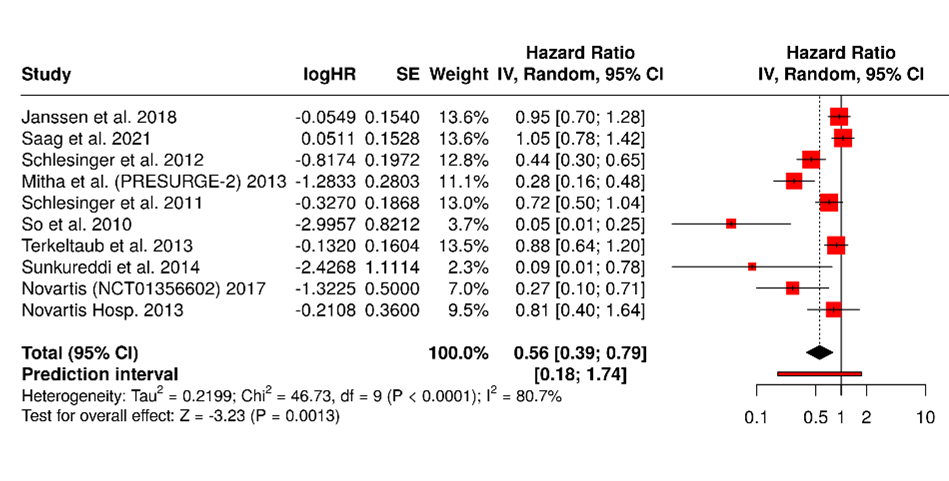 Figure 3. A total of 10 studies were included in the analysis. Using a random-effects model with the inverse variance method to compare hazard rates (HR), the pooled HR was 0.56 with a 95% confidence interval ranging from 0.39 to 0.79. The overall effect was statistically significant (p<0.05). However, substantial heterogeneity was present (p<0.01), with an I² value of 81%, indicating that most of the variability across studies was due to true differences in effect size rather than random variation.