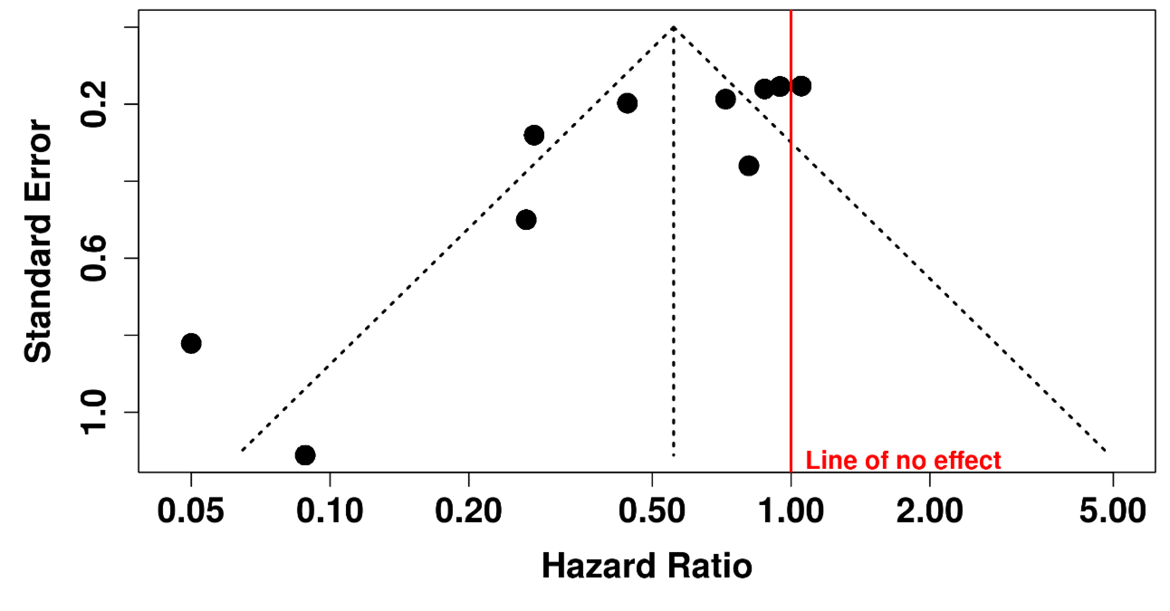 If a minimum of 10 studies were available for a given outcome, we planned to assess potential publication bias visually using funnel plots and statistically using Egger's regression test. An asymmetric funnel plot or a significant Egger's test (p<0.10) would suggest the potential for small-study effects or publication bias (Figure 11).