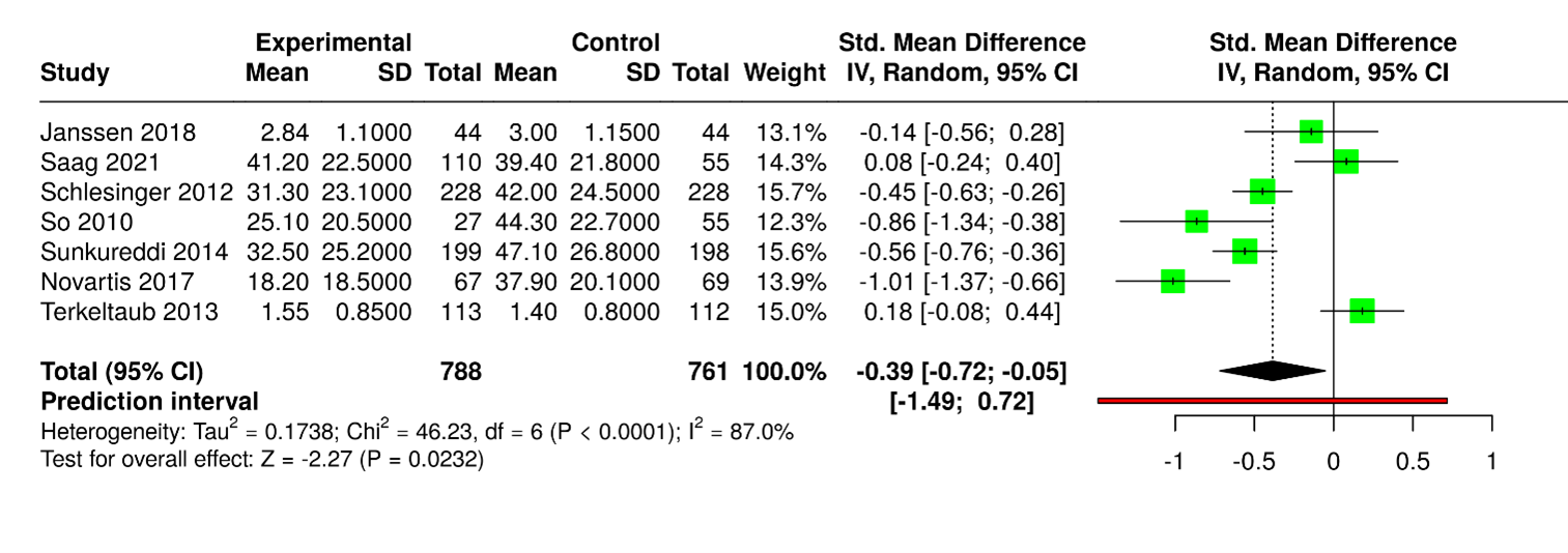 Figure 5. Seven studies with 1,549 participants (788 experimental, 761 control) were analyzed. The pooled standardized mean difference (SMD) was –0.39 (95% CI: –0.72 to –0.05), favoring the experimental cohort with statistical significance (p < 0.05). High heterogeneity was observed (I² = 87%, p < 0.01), reflecting inconsistent effect sizes. Study outcomes varied: some trials showed minimal differences [9,16], while others demonstrated clear advantages for the experimental group [12,17]. Larger studies, including [18,19], consistently reported higher mean values in controls, underscoring variability across populations and measurement tools.