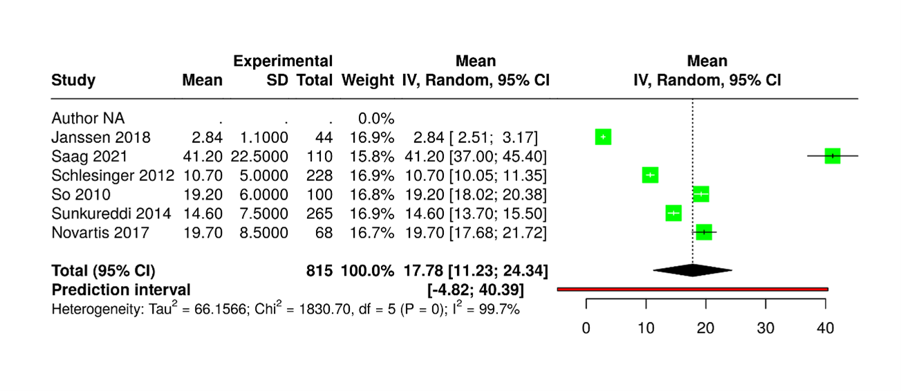 Figure 6. Six studies were analyzed, though subject numbers were not available. Using a random-effects model with the inverse variance method, the pooled raw mean (MRAW) was 17.78 (95% CI: 11.23–24.34). Heterogeneity was extreme (I²=100%, p<0.01), indicating that all variability arose from true differences rather than chance. The dataset was structured for meta-analysis, with columns specifying author, year, sample size, group means, and standard deviations, along with an inclusion flag for analysis control. This standardized format ensures compatibility with platforms such as RevMan, CMA, or R, and supports reliable pooling of continuous outcome measures.