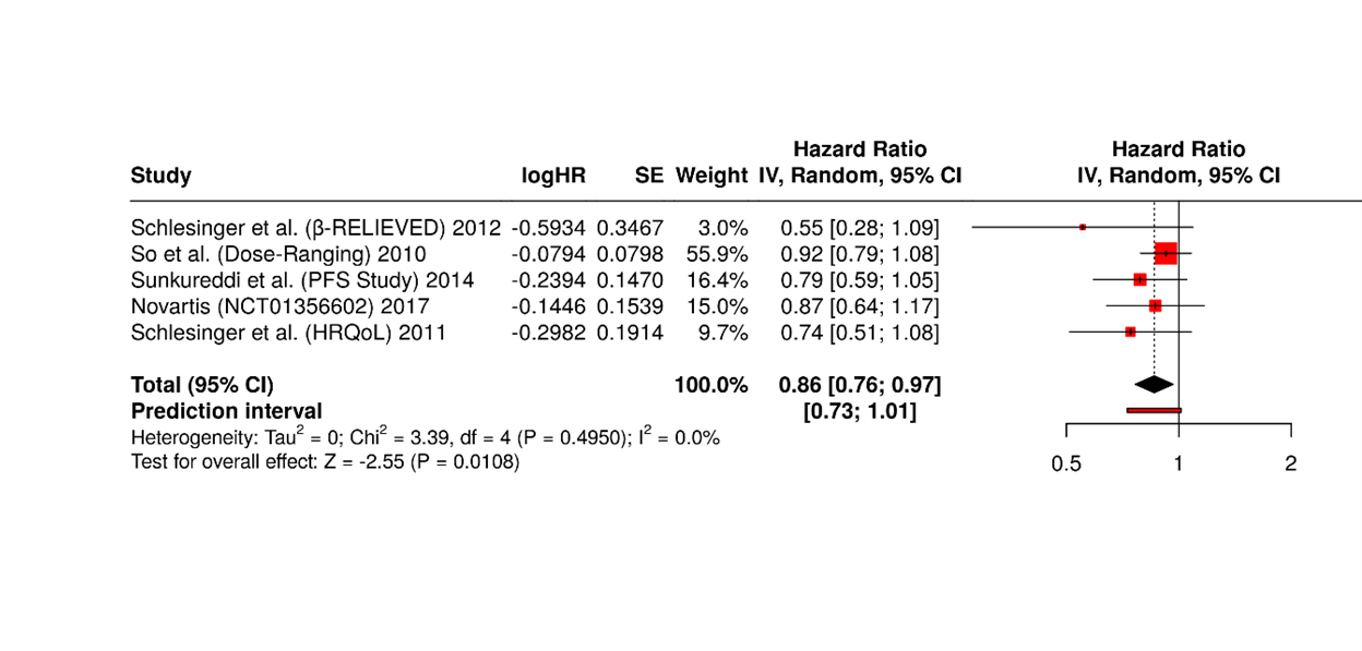 Figure 7. Five Canakinumab trials showed consistent benefit, with pooled HR 0.86 (95% CI: 0.76–0.97, p<0.05). No significant heterogeneity was detected, indicating uniform effect sizes across cohorts under random-effects analysis.