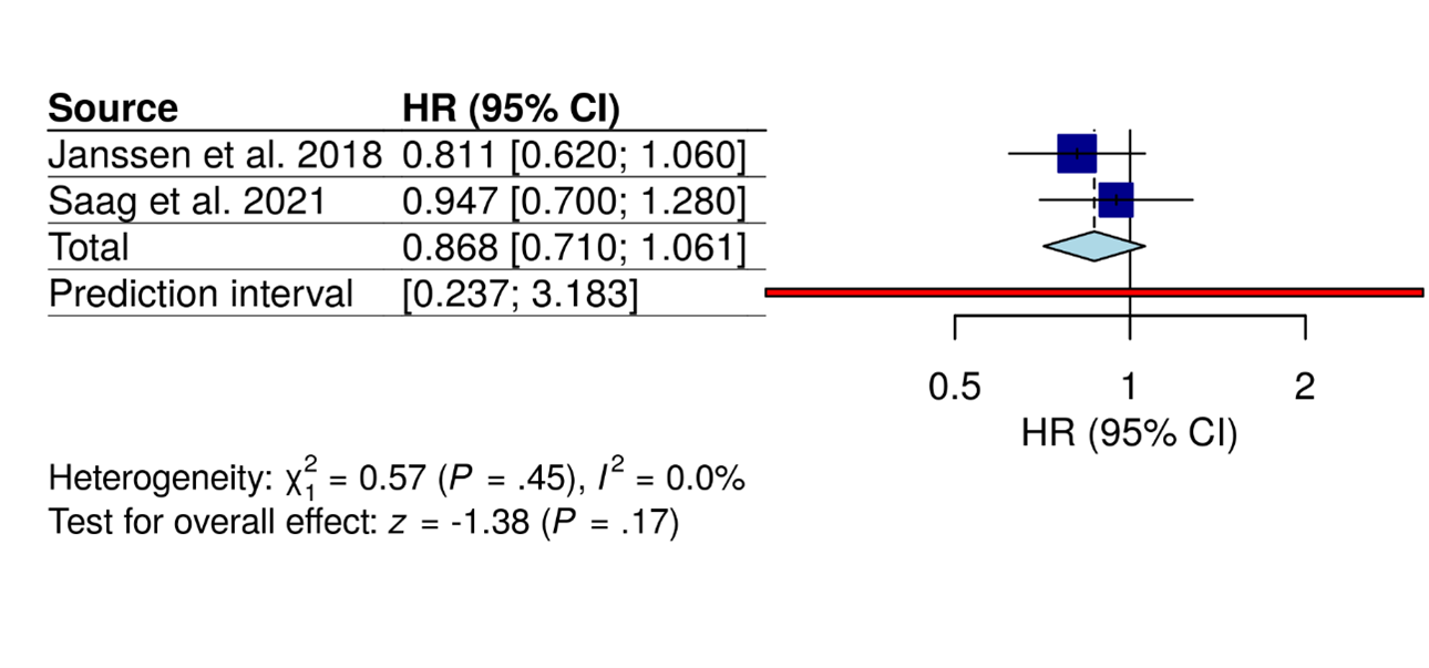 Figure 8. Two Anakinra trials showed no significant effect, with pooled HR 0.87 (95% CI: 0.71–1.06). Fixed-effect analysis indicated uniform results across cohorts, and overall effect testing did not reach statistical significance.