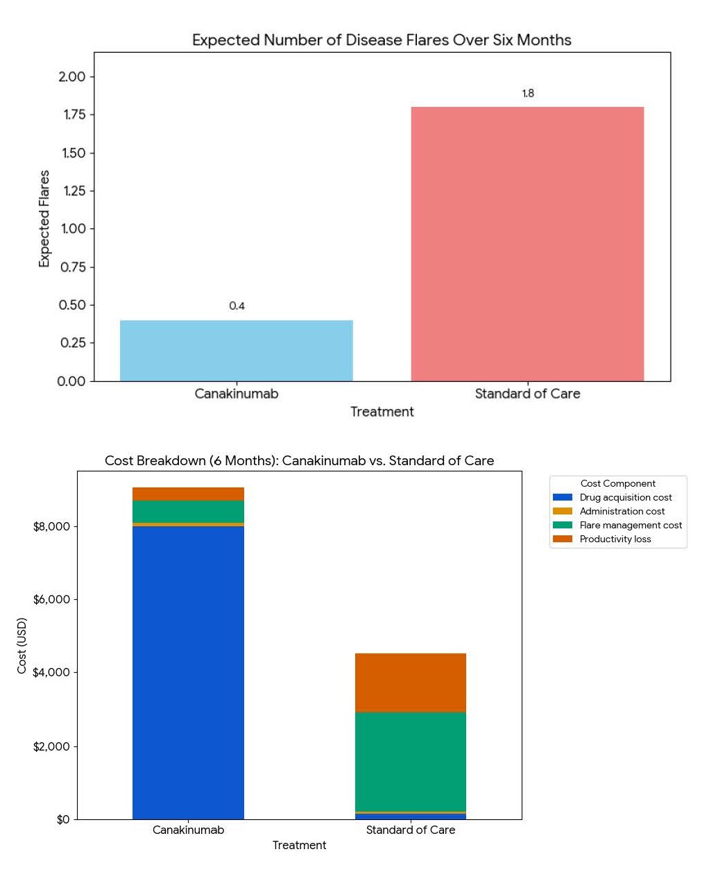 Over a six-month period, treatment with Canakinumab results in an estimated additional cost of $4,540 compared with standard Triamcinolone therapy but prevents approximately 1.4 disease flares. The incremental cost per flare avoided is approximately $3,243, suggesting that while Canakinumab is substantially more expensive, it offers potential value in reducing recurrence and productivity loss (Figure 10).