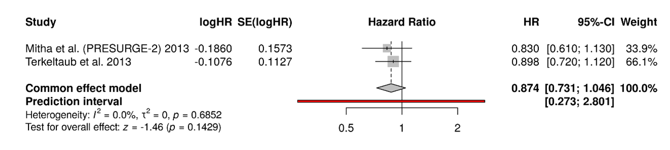 Figure 9. Two Rilonacept trials showed no significant effect, with pooled HR 0.87 (95% CI: 0.73–1.05). Fixed-effect analysis found no heterogeneity, indicating consistent effect sizes across cohorts without statistical significance.