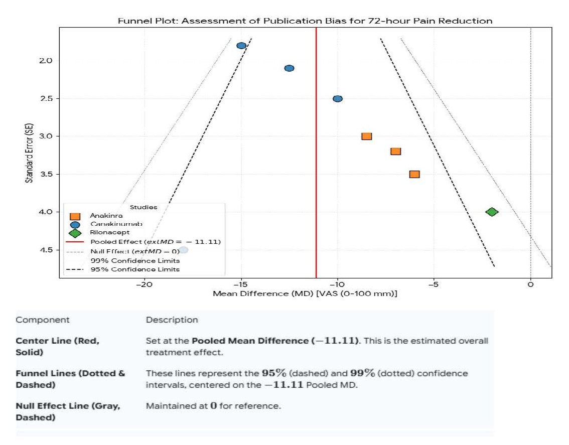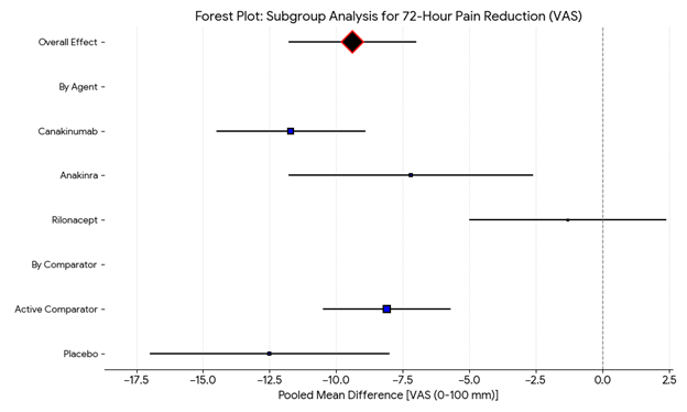 To explore potential sources of heterogeneity and test the robustness of our primary findings, we planned several subgroup and sensitivity analyses. Subgroup analyses were predefined for the primary outcome (72-hour pain reduction) (Figure 12) based on: (1) specific IL-1 inhibitor agent (anakinra, canakinumab, rilonacept); (2) type of comparator (active [e.g., triamcinolone, NSAIDs] vs. placebo); (3) patient comorbidity profile (studies with a high prevalence of chronic kidney disease [CKD] >30% vs. those with lower prevalence); and (4) study duration. Heterogeneity within and between subgroups was assessed using the I² statistic and a test for subgroup differences. For sensitivity analysis, we planned to sequentially exclude studies judged to be at a high risk of bias to determine their influence on the pooled effect estimate.