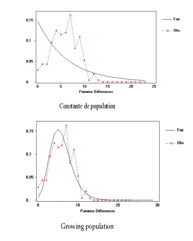 The study of the genetic evolution of D-Loop mutations in ovarian cancer in Senegalese women is marked by high polymorphism with high haplotypic diversity (Hd=0.922) and low nucleotide diversity (Pi=0.017) in cancerous tissues. D-Loop mutations are therefore believed to grow rapidly in ovarian tumors. Cancer cells contain many clonal mutations, i.e. mutations that are present in most or all malignant cells in a tumor and they confer a proliferation advantage. Thus, a malignant tumor is a disease characterized by abnormally high cell proliferation within normal body tissue, such that the survival of the body is threatened. Tests of the neutrality of cancerous tissues have shown that the D of tajima and the D* of Fu and Li are negative and insignificant, which makes it possible to affirm that the mutations found are neutral. Indeed, for non-coding sequences such as the mtDNA control region, a discrepancy in neutrality is probably explained by recent demographic changes rather than by selection [25]. Moderate population growth in cancerous tissues is also confirmed by the multimodal distribution of mismatch curves.