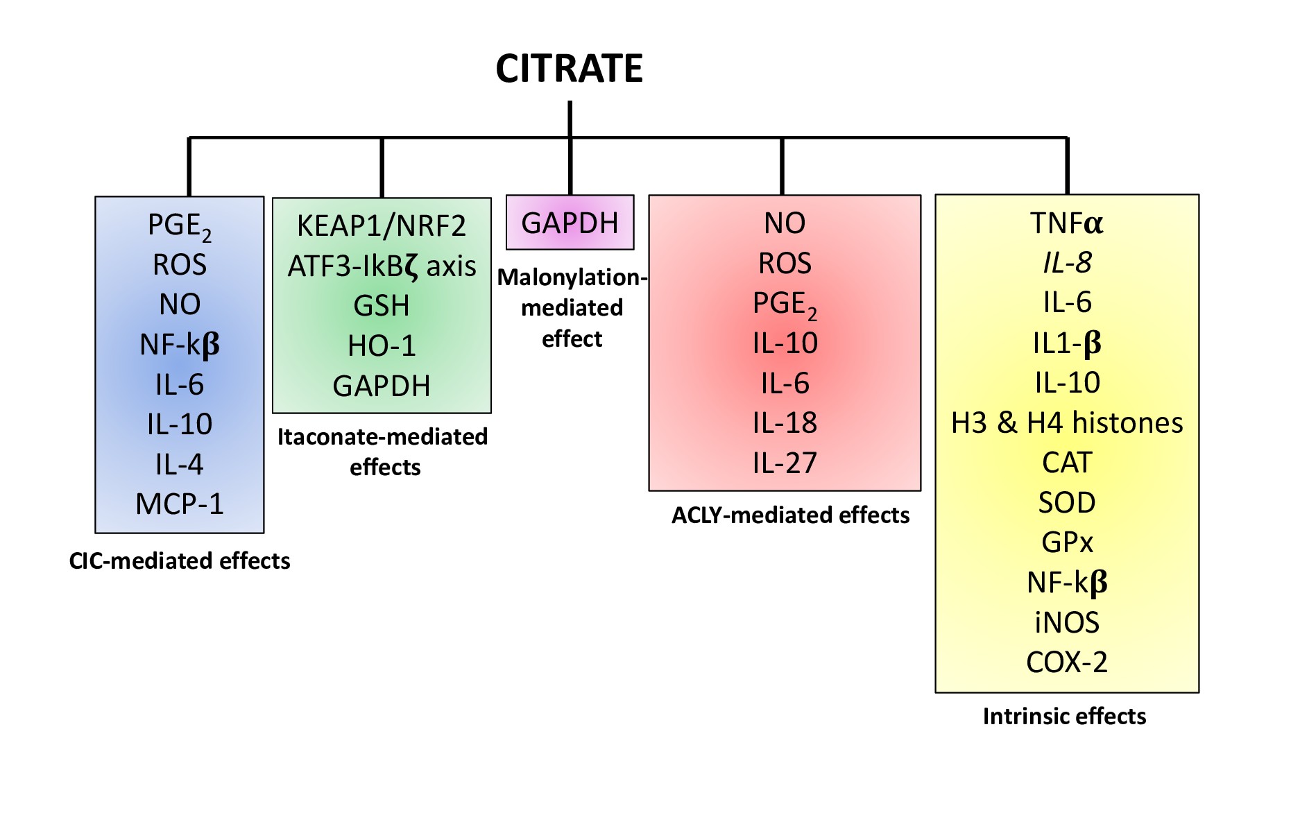 Citrate plays an immunomodulatory role through the IRG1-dependent production of itaconate and its transmembrane carrier CIC. Its availability in the cytosol provides acetyl-CoA pool for ACLY-mediated and malonylation-mediated regulation of genes and proteins involved in inflammation signaling and oxidative stress development, such as IL1-β, COX-2, NO and PGE2.