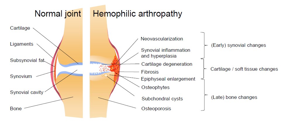 Upon joint bleeding, the synovial tissue is triggered by the presence of blood in the joint cavity. Synovial tissue is highly vascularized as it is responsible for removal of blood in the joint space and also for the production of synovial fluid for nutrition and lubrication of the joint. Blood entering the joint leads to an influx of inflammatory cells like macrophages, that remove blood from the joint cavity by phagocytosis. However, recurrent or ongoing joint bleeds overload the synovial capacity resulting in iron accumulation. The presence of iron triggers an inflammatory response and stimulates the proliferation of synoviocytes, which start producing cytokines and proteinases. The normally thin synovium becomes hypertrophic and needs more oxygen resulting in an increase of vascular endothelial growth factor (VEGF) and the formation of new fragile blood vessels. Besides the formation of new vessels accompanied by an increased risk of hemarthrosis, pro-inflammatory cytokines and proteases also upregulate cartilage-degrading enzymes. Together with the direct effects of blood on cartilage, chondrocyte apoptosis is induced. In a more advanced stage, blood in the joint cavity leads to bone changes like subchondral cysts and edema [1,5].