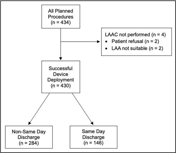 The prevalence of atrial fibrillation (AF) has continued to rise throughout the 21st century due to increased life expectancy and improved survival among patients with chronic comorbidities [1]. Left atrial appendage closure (LAAC) has emerged as a pivotal strategy for stroke prevention in patients with nonvalvular AF who are not ideal candidates for long-term anticoagulation with Vitamin K antagonists or Factor Xa inhibitors [2]. Studies have reported seven-day procedure-related complication rates of 8.7%, 4.2%, and 2.7% in the PROTECT-AF, PREVAIL, and EWOLUTION trials, with perioperative complication rates at an estimated rate of 1.19% [3–6]. The improved procedural safety of LAAC, increased operator experience, and procedural refinement has prompted increasing interest in same-day discharge (SDD) protocols as an alternative to the traditional overnight hospital observation.