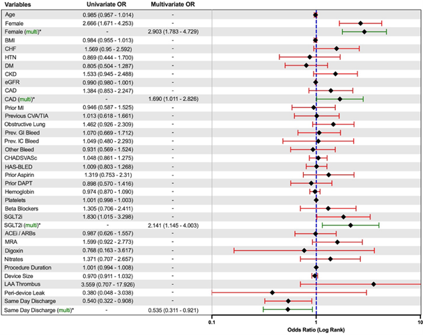 The overall mortality rate for both patient groups was comparable and low at 1.4% in SDD and 0.7% in non-SDD (p=0.50). A univariate and multivariate logistical regression model for readmission rates within 30 days of discharge was used to further assess the likely contributory risk factors. There were higher rates of readmissions for patients who were female (odds ratio [OR] 2.903, 95% CI – 1.783 to 4.729), who had a prior diagnosis of CAD (odds ratio [OR] 1.690, 95% CI – 1.011 to 2.826), or were on an SGLT2i (odds ratio [OR] 2.141, 95% CI – 1.145 to 4.003) prior to the LAAC procedure. SDD (odds ratio [OR] 0.535, 95% CI – 0.311 to 0.921) was associated with reduced rates of readmissions within 30 days of WATCHMAN device deployment.