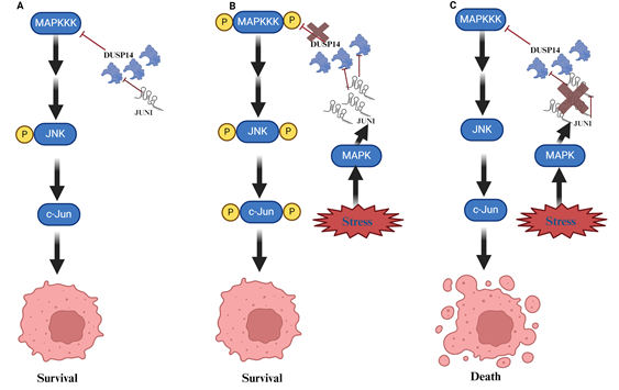 Figure 1. A cartoon describing the role of JUNI (JUN-DT) for cancer cell survival following UV exposure. A. In normal/unstressed cells, which do not have to cope with stress, the mitogen activated protein kinase (MAPK) pathway, which is composed, among the rest, by c-Jun N-terminal kinase (JNK) and the kinases activating it (MAPKKs and MAPKKKs), is mildly activated, c-Jun is not upregulated. B. In cells exposed to UV the MAPK pathway is activated by phosphorylation cascade, and c-Jun is highly phosphorylated to support survival. MAPK also supports JUNI’s induction that in turn prevents the de-phosphorylation of JNK by interacting and inhibiting the phosphatase DUSP14, thereby enabling efficient induction of c-Jun and survival. C. In cells exposed to UV concomitantly with JUNI (JUN-DT) silencing, DUSP14 activity is not restricted therefore it prevents efficient phosphorylation of JNK and c-Jun activation rendering the cells more sensitive, and increased apoptotic death is observed [21].