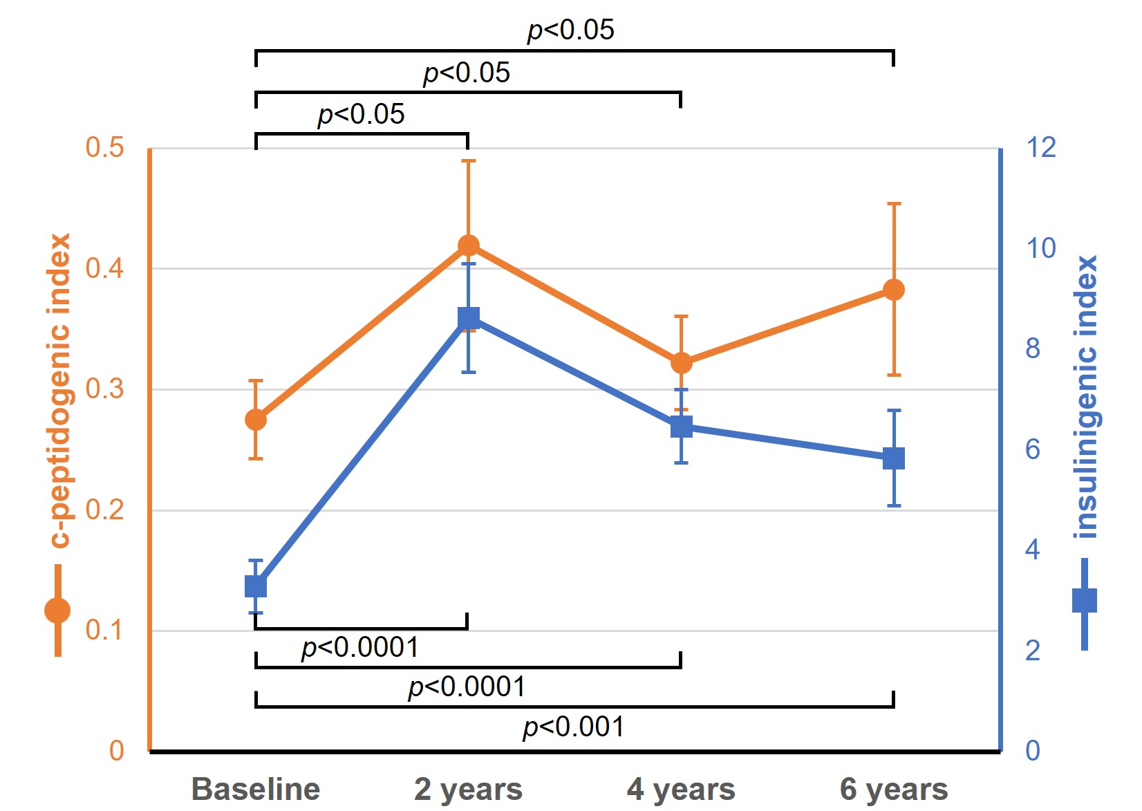 Following treatment with CSII, HbA1c significantly decreased from 7.7±0.2% at baseline to 6.3±0.1% at 2 years and remaining stable at 6.4±0.1% at 4 years and 6.5±0.1% at 6 year (p<0.0001 for all timepoints; Table 2, Figure 1). And total daily insulin requirements also significantly decreased from 48.6±3.1 U/day to 34.2±2.2 U/day at 6 years (p<0.0001; Figure 2). Furthermore, CSII significantly increased c-peptidogenic index, a surrogate marker for β-cell function, from 0.28±0.03 to 0.38±0.07 at 6 years (p<0.05; Figure 2), indicating the partial preservation of endogenous insulin secretion. The insulinogenic index also increased from 3.28±0.53 to 5.84±0.96 at 6 years (p<0.001; Figure 3), demonstrating an enhanced early-phase insulin response. Overall, insulin pump therapy significantly improved glycemic control, TDD, and c-peptidogenic and insulinogenic index as compared to the levels observed at the initiation of insulin pump therapy.