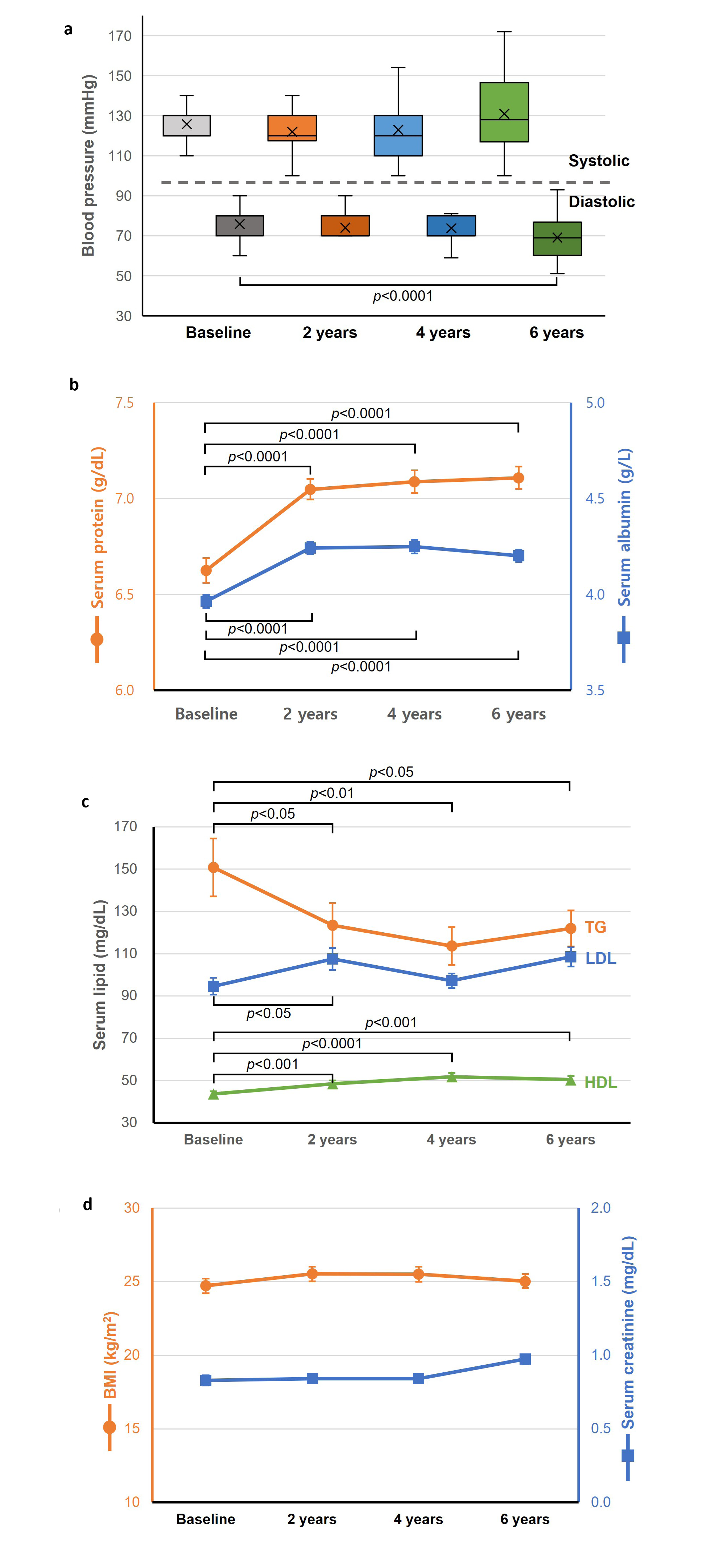 Diastolic blood pressure decreased significantly from 75.9±0.9 to 69.1±10.6 mmHg (p<0.0001) (Table 3), while systolic pressure slightly increased (Figure 4a). Serum protein and albumin levels significantly increased (p<0.0001; Figure 4b), suggesting improved nutritional status. Lipid profiles showed improvements in HDL (from 43.7±1.3 to 50.4±1.8 mg/dL, p<0.001) and triglycerides (from 150.8±13.8 to 121.9±8.5 mg/dL, p<0.05), with modest increases in LDL and total cholesterol (Figure 4c). On the other hand, no significant change from baseline in BMI or serum creatinine were observed throughout the observation period (Figure 4d).
