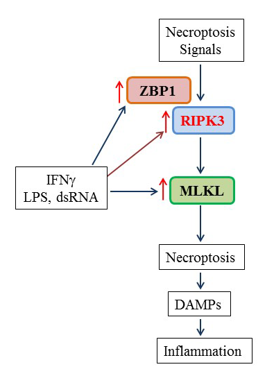 By using bone marrow-derived macrophages, we have recently reported that that M1 macrophages induced by LPS, IFNγ and dsRNA were much more sensitive than M0 and M2 subtypes of macrophages to various necrotic cell death inducers. The enhanced necroptosis in M1 macrophages is dependent on RIPK3 kinase activity and may involve the upregulation of key necroptosis signaling molecules including RIPK3, MLKL and ZBP1 (Figure 1). These findings provide novel insights into the mechanisms of M1 macrophage engagement in inflammation and tissue injury. Since we used bone marrow-derived macrophages for the study, it will be important to determine if M1 macrophages are more susceptible to necroptosis in vivo under disease conditions. Although inhibition of necroptosis confers protection against tissue injury and inflammation, the role of macrophages in the process is not clear. Generation of macrophage-specific knock out of RIPK3 will enable us to address this gap in current knowledge and to identify a specific therapeutic target that could be further developed to control various forms of inflammation and tissue injuries, in which macrophage death is a common feature.
