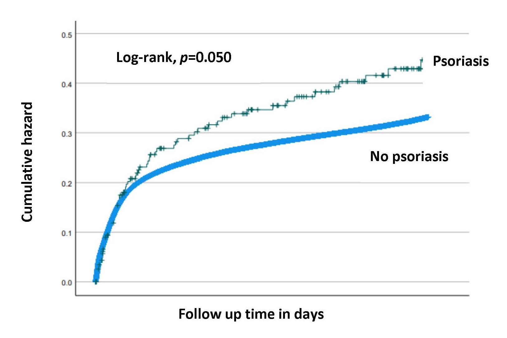 Figure 1. Kaplan-Meier survival curve for the cumulative incidence of long-term infectious morbidity of the offspring born to mothers with and without psoriasis (Log-rank, p=0.050).