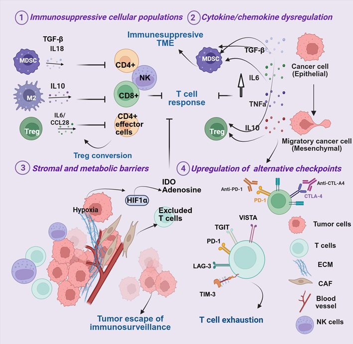 Resistance across these cancers, whether primary (non-response) or acquired (relapses following initial response), emerges from a multifaceted interplay of tumor-intrinsic factors (e.g., antigen-presentation loss, signaling pathway alterations) and microenvironmental barriers (e.g. immunosuppressive cells, stromal remodeling) and systemic host-related constraints (e.g. metabolism, microbiome) that collectively blunt effective antitumor immunity [18–20].