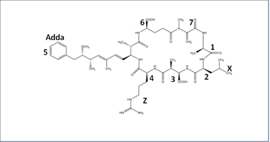 Structurally, most MCs are cyclic heptapeptide molecules with the same basic structure of seven amino acids forming a ring with the Adda group and a b-amino acid at the end [1]. Its basic structure is cyclo-(D-Ala1-X2-D-Masp3-Z4-Adda5-D-γ-Glu6-Mdha7), with the second and fourth amino acids leading to the most variation (Figure 1) [1]. The Adda residue is believed to be the major cause of toxicity because it allows MC to bind to the enzymes protein phosphatases PP1 and PP2A, thereby inhibiting them [2]. The standard nomenclature for MC is MC-XZ, with X and Z being the second and fourth-position amino acids, respectively [1]. MC-LR (Figure 1) has been the most widely studied MC molecule due to its high toxicity and widespread occurrence worldwide in irrigation and drinking water [2].