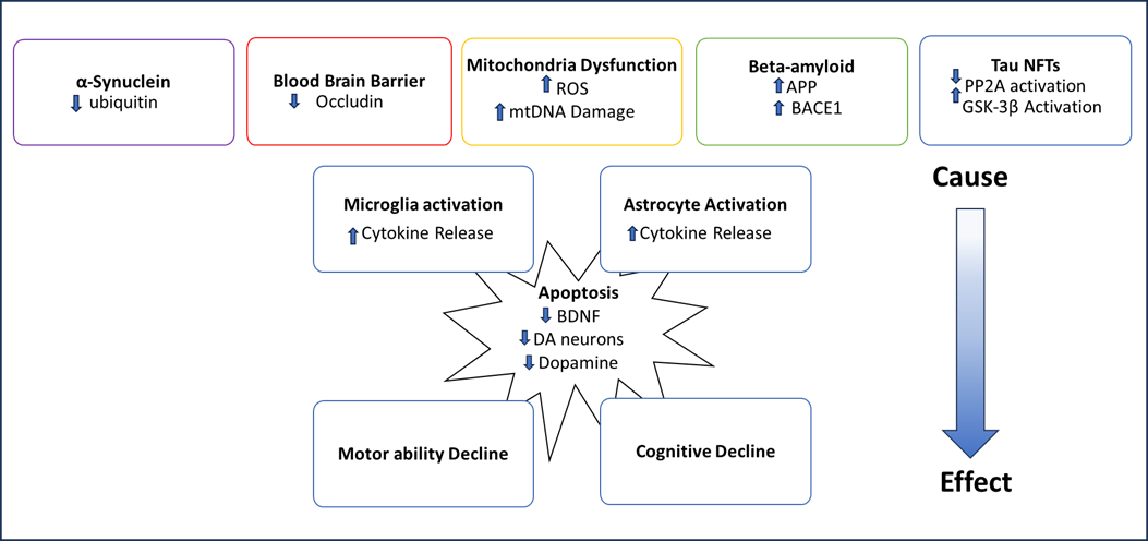 ↑ α- Synuclein ↓ Ubiquitin ↑ Reactive microglia ↑ Cytokines |