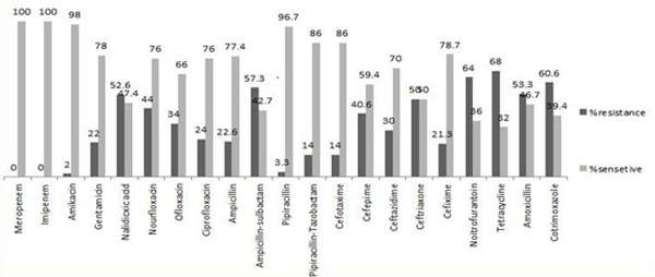In general, 33.3% (50 people) of the studied people were outpatients and the remaining 66.6% (100 people) were in-patients. Studying these patients for 12 months, 74 (49.3%) patients showed at least a relapse of urinary infection, and in these cases, 68% of the isolates were resistant to ampicillin, (64%) tetracyclin, (60.6%) cotrimoxazole, (57.3%) piperacillin, respectively. Besides, the highest antibiotic susceptibilities were detected for Imipeneme, Meropeneme (100%), Amikacin (98%), and (96.7%) piperacillin/tazobactam, respectively (Figure 1).