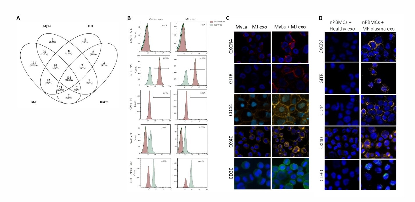 Figure 1. The proteomic content and delivery of exosomes derived from CTCL cell lines. Venn diagram depicting the overlapping proteins identified in exosomes derived from four CTCL cell lines using mass spectrometry (A). FACS analysis of CXCR4, GITR, CD44, OX40, and CD30, along with their matched isotype controls, in MJ- and MyLa-exosomes conjugated to beads (B). Immunostaining of MyLa cells incubated with MJ-exosomes to monitor the internalization of exosomal CXCR4, GITR, CD44, CD30, and OX40 (C). Immunostaining of T-cell culture incubated with exosomes from plasma of MF patients, compared to plasma from healthy donors, to detect the uptake of CXCR4, GITR, CD44, and CD30 (D).