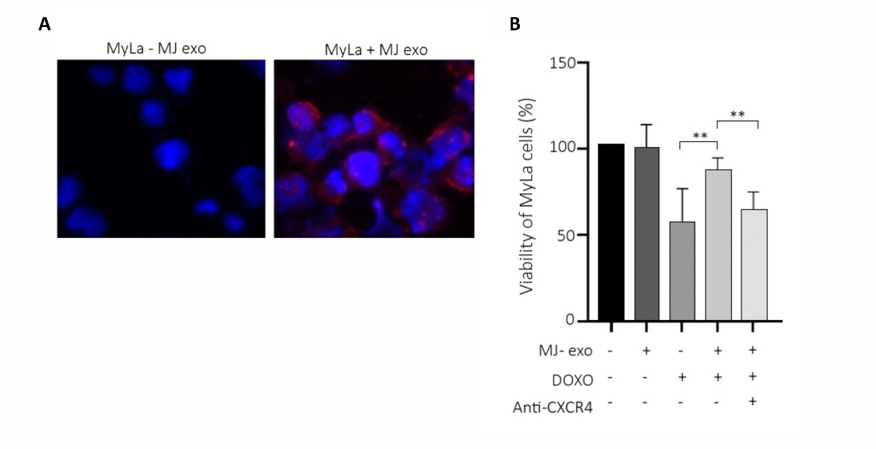 MyLa cells were treated with MJ-exosomes for 24h, then cells were treated with Doxorubicine (20 nM) (Teva) for another 24 h and with AMD3100 (20 µg/mL) (Sigma). Cell viability assay was done by MTT [19].