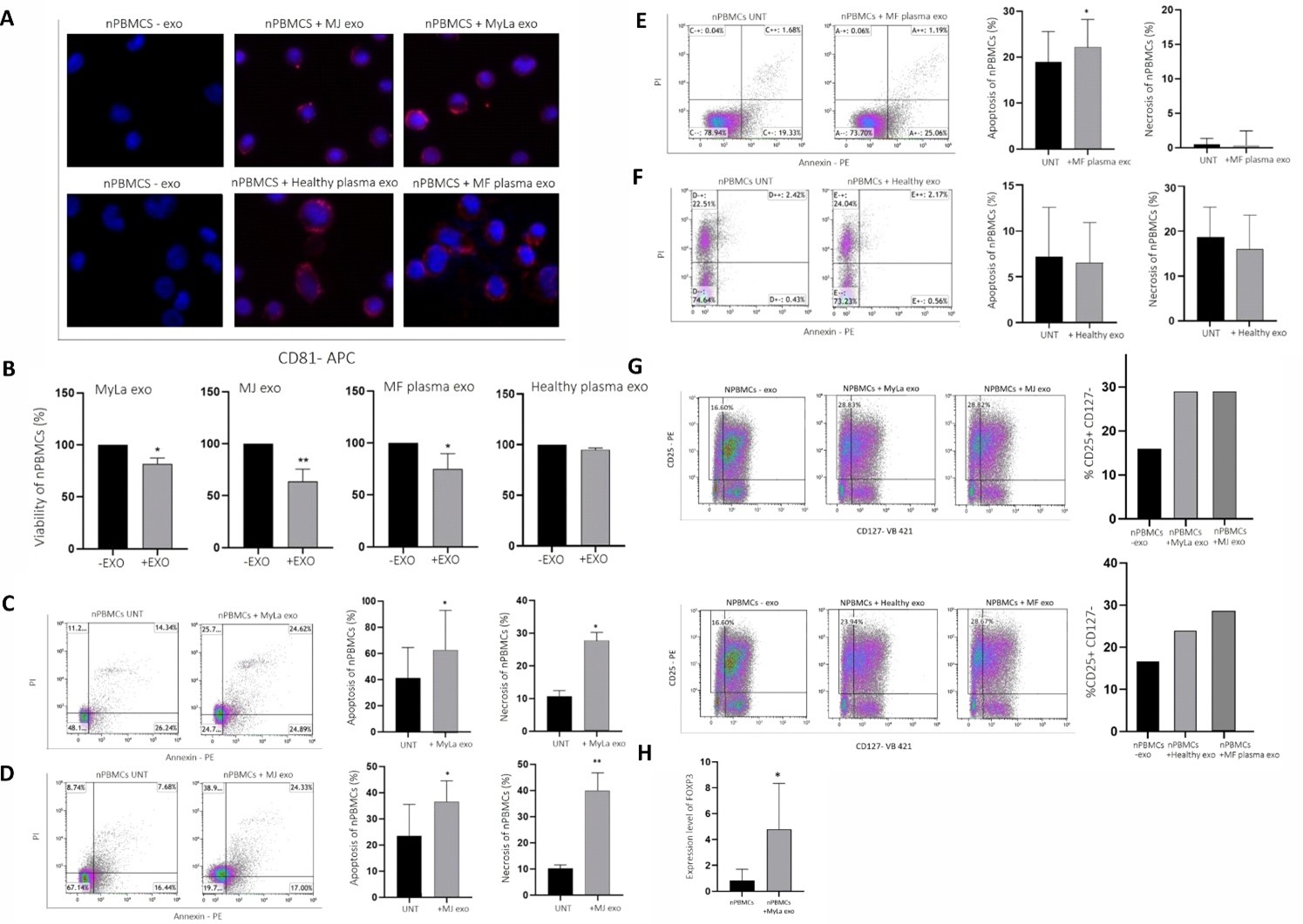 Figure 3. Exosomes derived from MF (cell lines and patients' plasma) decrease the viability of T cells and promote polarization of Tregs. Immunostaining of the exosomal marker CD81 in T cell culture incubated for 24 h with exosomes derived from MF cell lines, plasma of MF patients or plasma of healthy donors (magnification x40) (A). The viability of the T cell culture, as determined by MTT assay was compared between cultures incubated with exosomes from MF cell lines, patients' plasma, and healthy donors' plasma, and cells without exosomes (B). Apoptosis and necrosis in the T-cell culture were assessed by FACS analysis of annexin V and PI staining, comparing the effects of exosomes derived from MyLa (C), MJ (D), plasma of MF patients (E), and plasma of healthy donors (F) to cells without exosomes. The frequency of CD25+CD127- cells in the T-cell culture was analyzed by FACS, comparing cultures with or without exosomes from MJ, MyLa, plasma of MF patients, and plasma of healthy donors (G). RT-qPCR was performed to measure the expression of FOXP3 in the T-cell culture with or without MyLa-exosomes (H).