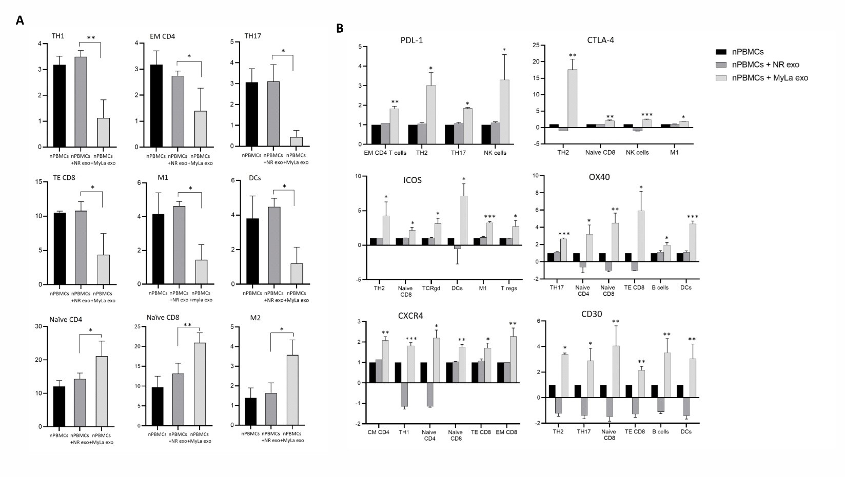 Figure 4. Comprehensive immune characterization of nPBMCs with and without MyLa-exosomes. Multiplexed single-cell flow mass cytometry for quantification of immune cell populations and expression of immune regulator proteins in nPBMCs with and without MyLa exosomes: the percent of several immune cell populations (A); expression of immune regulator proteins in specific immune cell subsets (B).