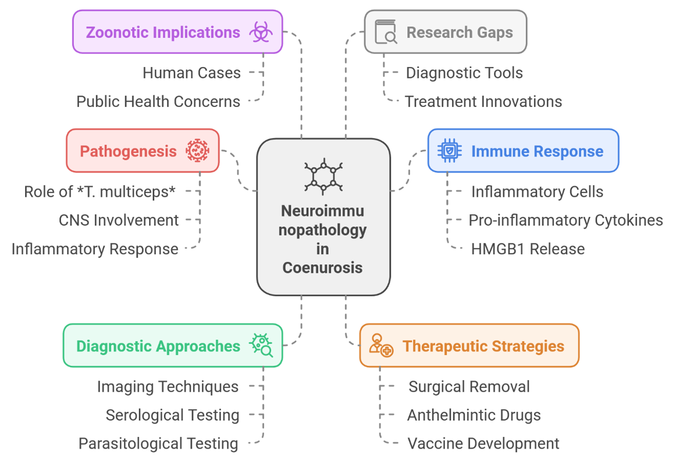 Coenurosis is a socioeconomically significant zoonotic disease. The neuroimmunopathology of this disease is complex, involving a dynamic interplay between the parasite and immune system dynamics of several hosts. Although current diagnostic and treatment approaches remain inadequate, there is some solace in the recent investigations leading to proper prevention and control mechanisms of coenurosis with the One Health philosophy, integrating veterinary medicine, parasitology, immunology, community medicine, and public health—while also addressing other neglected trematode pathogens. Comprehensive research into the molecular mechanisms of coenurosis pathogenesis is still required to develop accurate diagnostic tools and effective therapeutic approaches, ultimately enabling adequate public health intervention strategies to limit the effect of this disease.