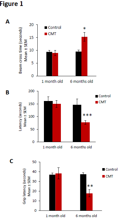 Behavioral data was confirmed using electromyography of control and CMT sciatic nerve at 1 month old and 6 months old.