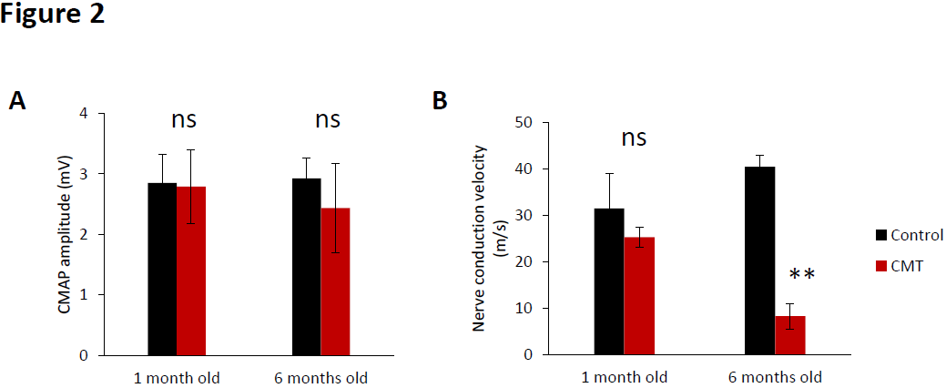 Figure 2.Sciatic nerve electrophysiology impairment observed in CMT mice. (A) Compound muscle action potential amplitude and (B) nerve conduction velocity of sciatic nerve of control (black bar) and CMT mice (red bar) at the baseline (1 month old) and at 6 months old. Error bars indicate SEM. Statistical tests are repeated measures two-way ANOVA test comparing CMT to control mouse values. * p<0.05, ** p<0.01, *** p<0.001, no significant (ns). n=5.