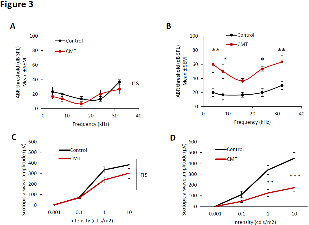 Figure 3. Hearing loss and visual impairment observed in CMT mice. Auditory brainstem responses of control (black line) and CMT mice (red line) at 1 month old (A) and 6 months old (B). Electroretinogram of control (black line) and CMT mice (red line) at 1 month old (C) and 6 months old (D). Error bars indicate SEM. Statistical tests are repeated measures two- way ANOVA test comparing CMT to control mouse values. * p<0.05, ** p<0.01, *** p<0.001, no significant (ns). n=5.